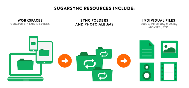The SugarSync service presents a set of resources that your application can access through the Platform API. The resources represent objects that SugarSync recognizes and manages, such as user accounts, workspaces, folders, and files.